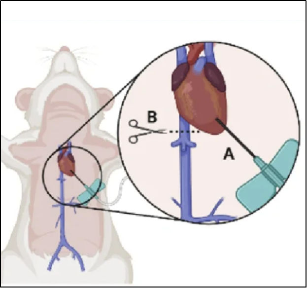 1、老鼠麻醉后立即将其用针头固定在泡沫板上(用针头插住四肢)。用镊子扯起胸部皮肤,另一只手用剪刀剪开胸腔的皮肤和肋骨,暴露出心脏和肝脏。