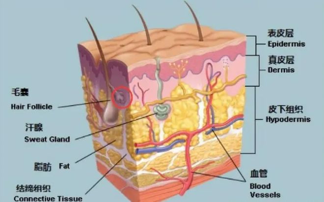 皮下组织:位于真皮下方,其下与肌膜等组织相连,由疏松结缔组织及脂肪小叶组成,又称皮下脂肪层。含有血管、淋巴管、神经、小汗腺和顶泌汗腺等。