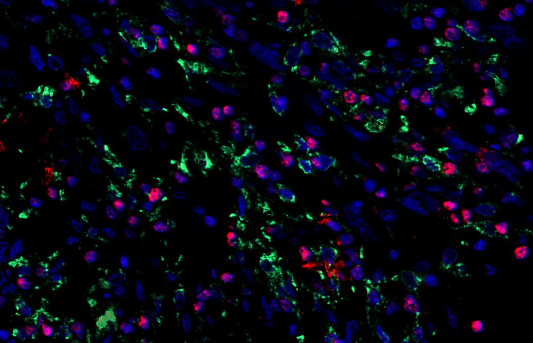 二、染色结果判读:DAPI染出来的细胞核在紫外的激发下为蓝色,阳性表达为相应荧光素标记的颜色。