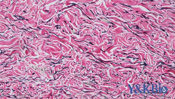 染色结果: 弹力纤维紫红色,胶原纤维红色,背景其他成分黄色