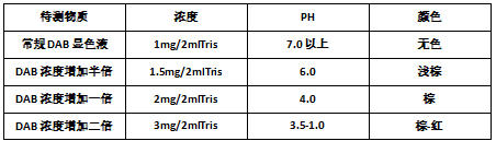 (5) DAB浓度是常规浓度的3倍时,0.05mol/LTris(pH7.6)缓冲液已不能缓冲过量H+浓度,从而使显色液的颜色由橙色变为深棕色。
