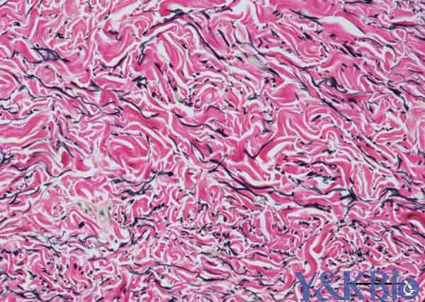 3.自来水冲洗,2%三.氯.化.铁溶液分化10-20s,显微镜观察弹性纤维呈黑色,背景呈灰色;