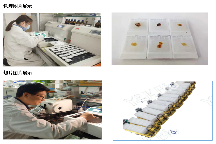 1.取材:取新鲜组织固定于 云南4%多聚甲醛 24h 以上。将组织从固定液取出在通风橱内用手术刀将目的部位组织修平整,将修切好的组织和对应的标签放于脱水盒内;