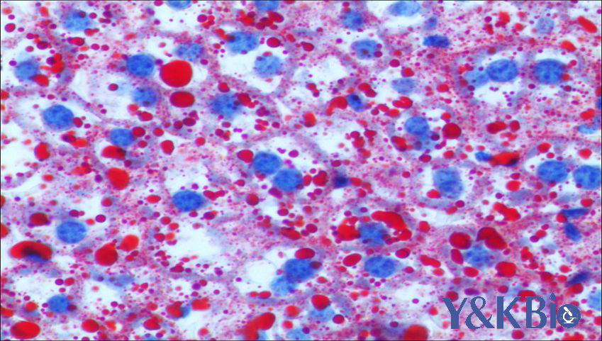 油红O脂肪染色法通常应用于检测组织或细胞内的脂肪情况,油性红O(Oil Red O)是一种脂溶性染料,是很强的脂溶剂和染脂剂,在脂肪内能高度溶解,其染色原理是油红O能特异性地与组织和细胞内的中性甘油三脂、脂质以及脂蛋白产生吸附作用从而使脂肪染色。染料在胞内脂质中的溶解度较溶液更大,当燃料加入组织切片时,燃料从有机溶剂转移而溶于组织内的脂质中,使组织内的脂肪呈红色。该染色方法用于分析细胞样品中脂质状况。