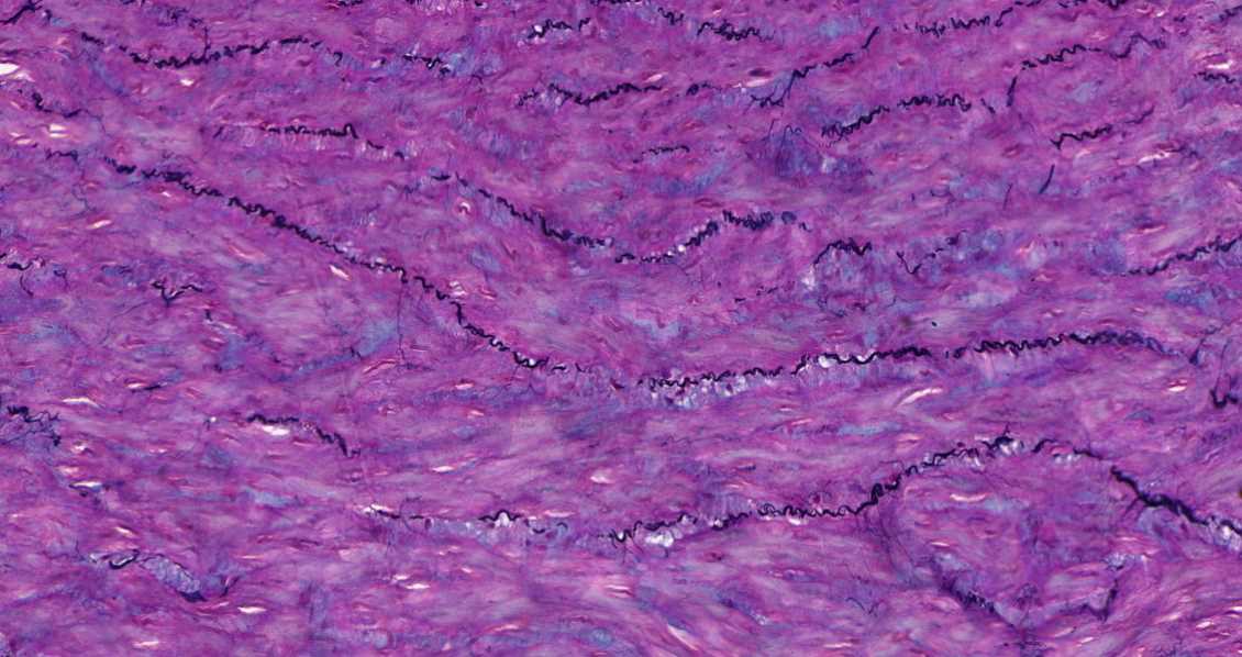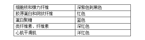 染色介绍 结缔组织狭义上是指其含有的三种纤维:胶原纤维、网状纤维、弹力纤维。结缔组织染色方法亦有很多种,如 Masson 三色染色法、Van Gieson染色法、Gomori 氨银法、Mallory 磷钨酸苏木素染色,然而以上染色方法只是侧重于某一两种组织的染色。 Movat 五色套染以其染色丰富、呈色鲜艳而大受欢迎。该染色法主要用于显示动脉粥样硬化斑块。Weigert 苏木素用于染细胞核和弹力纤维,藏红品红用于染细胞质和肌肉纤维,藏红花染胶原组织,阿利新蓝染基质(蛋白聚糖)。